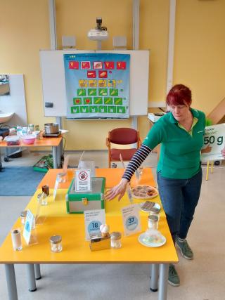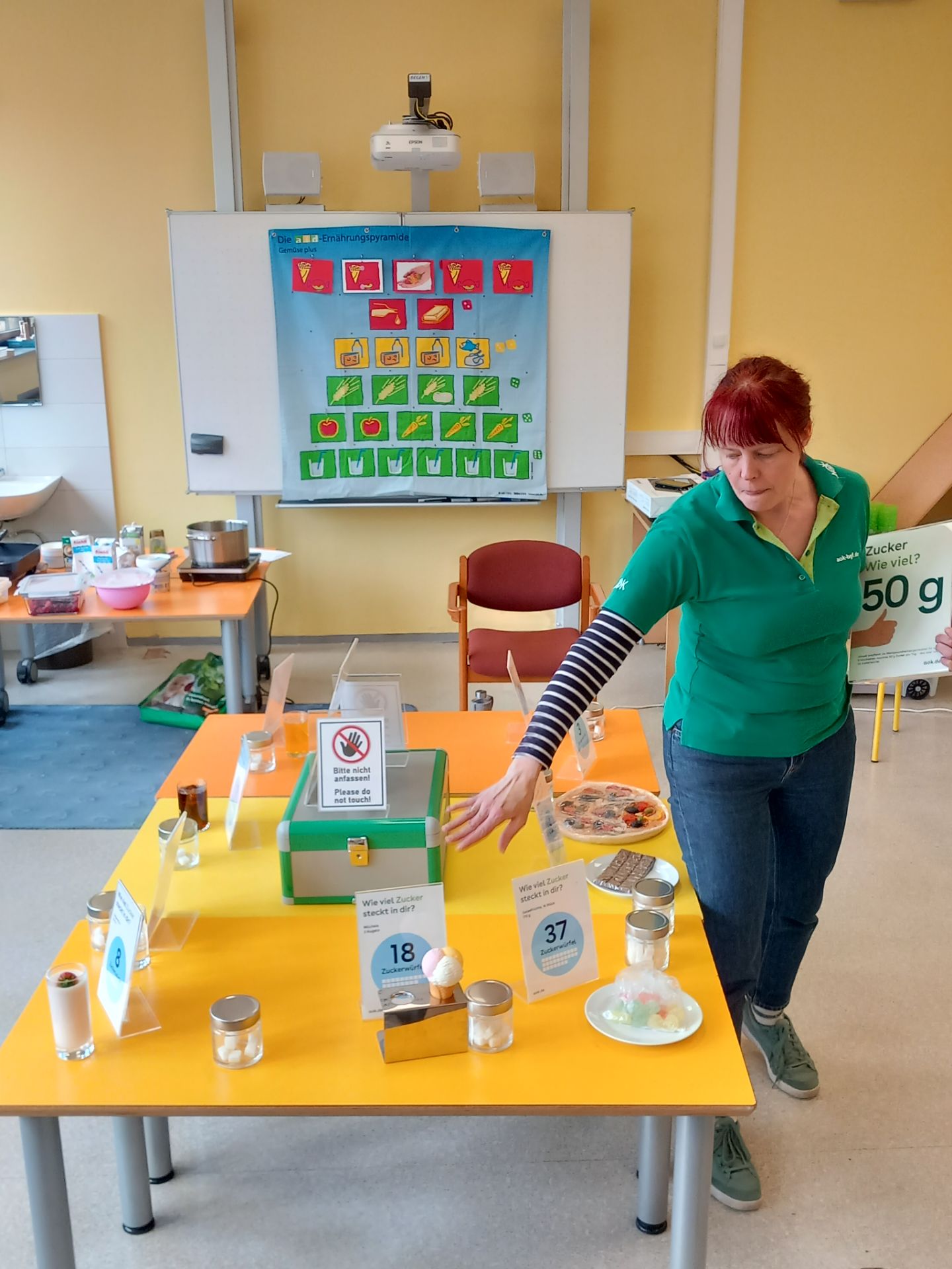 Für die Projektwoche wurde von der AOK die Zuckerausstellung zur Verfügung gestellt. Diese wurde von Frau Pauli, einer ausgebildeten Ernährungsberaterin, in allen Klassen analysiert. Die Ernährungspyramide als Wegweiser für ein gesundes Essverhalten wurde ebenso erklärt. Die Umsetzung des theoretischen Wissens in der praktischen Zubereitung eines gesunden Müslisschloss sich an. Alle waren sich einig: Gesundes ist auch lecker!