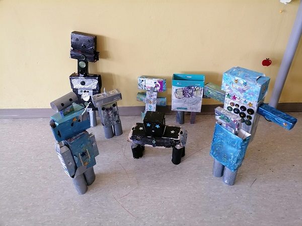 Im Rahmen des Themas „Müll“ bastelten die Kinder der Klasse 1/2b Roboter aus Kartons und anderen „Abfällen“.